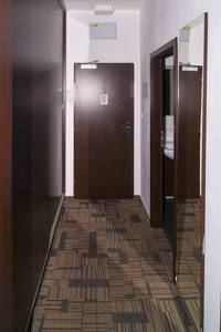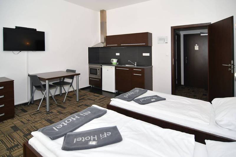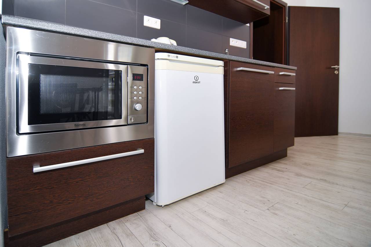 Furnished apartment for rent 1 + kk on the first floor with a total area of 29. The apartment is equipped with a Samsung air-conditioning unit, including a remote control. 41 m 2 . Entrance 2.88 m 2 , bathroom 4.07 m 2 , room with kitchenette 20.91 m 2 , balcony 1.55 m 2 . The windows are situated on the south side to the courtyard of the building. The apartment features a kitchenette with a Wenge kitchen unit and an Egger Jura black worktop with Indesit VRM 640 MC ceramic hob with four cooking zones, an Elica Missy 60 / IX chimney hood, a built-in Baumatic BMC253SS microwave oven with grill and hot air oven. , base fridge indesit TFAA 10. Dining table + 2 chairs. Work table and chairs, two beds 90 x 200 cm color Wenge, which can be assembled individually or as a double bed. There is a built-in wardrobe in the hall. Bathroom with bath 150 cm, sink and toilet, bathroom cabinet LeBon, color Wenge. Central heating with radiators, hot water heating with electric intelligent heater OKHE SMART with hot water tank for 100 l. Apartment windows with insulating triple glazing.
